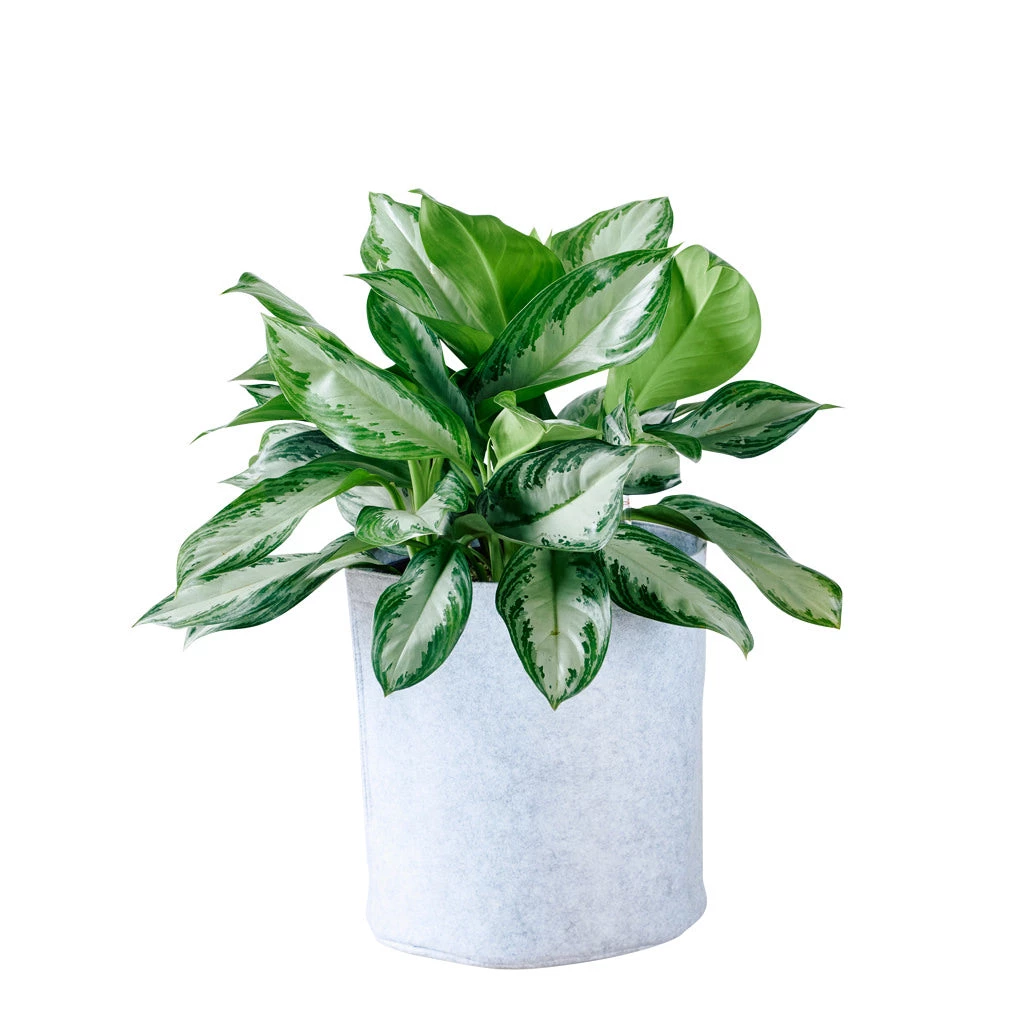 Aglaonema plant potted in Lechuza self-watering stylish planter. Very popular plant due to its variety of leaf patterns, shape, and ability to grow in low light spaces. It is an excellent plant for an area, like a north-facing window, that does not have any direct sunlight.
