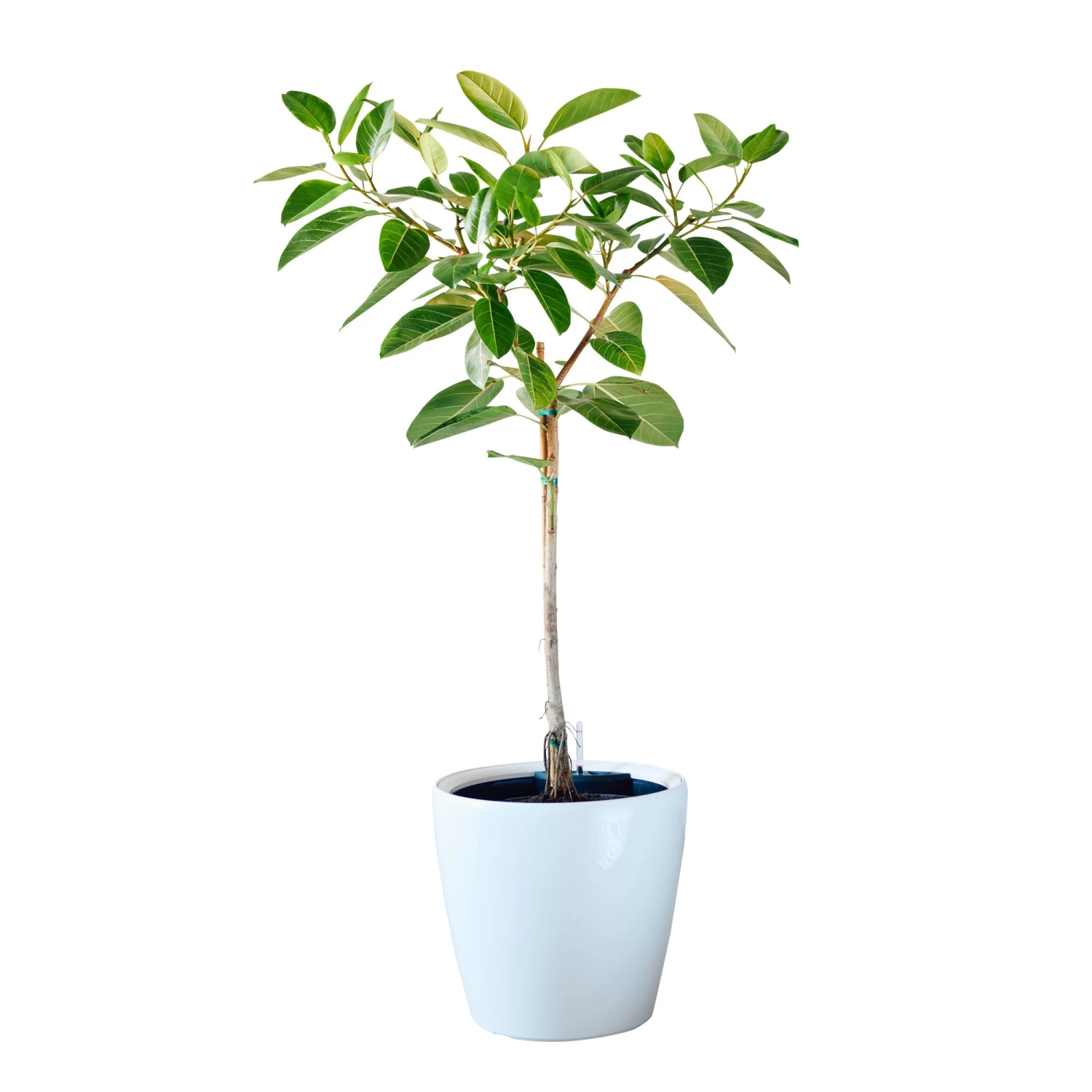 Beautiful tropical indoor tree Ficus Altissima is potted in an elegant self-watering Classico 50 planter. This Ficus variety is called “Yellow Gem” for its bright yellow variegated leaves with patches of light and dark green colors. This plant can be a bit dramatic and drop a few leaves during its acclimation period. Once acclimated, the plant will stabilize and grow new leaves rapidly. Since Ficus Altissima can be fussy at times, we do not recommend this plant to beginners 🙂