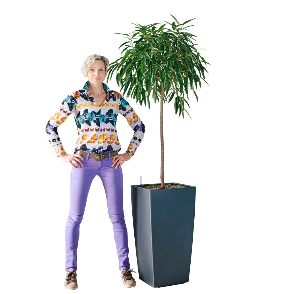 - Planter: Built in sub-irrigation system (water your plant 3 times less often in comparison to regular pots). Made by Lechuza in Germany, shatterproof, 100% recyclable plastic. White color – glossy finish. Charcoal metallic color – matte finish.