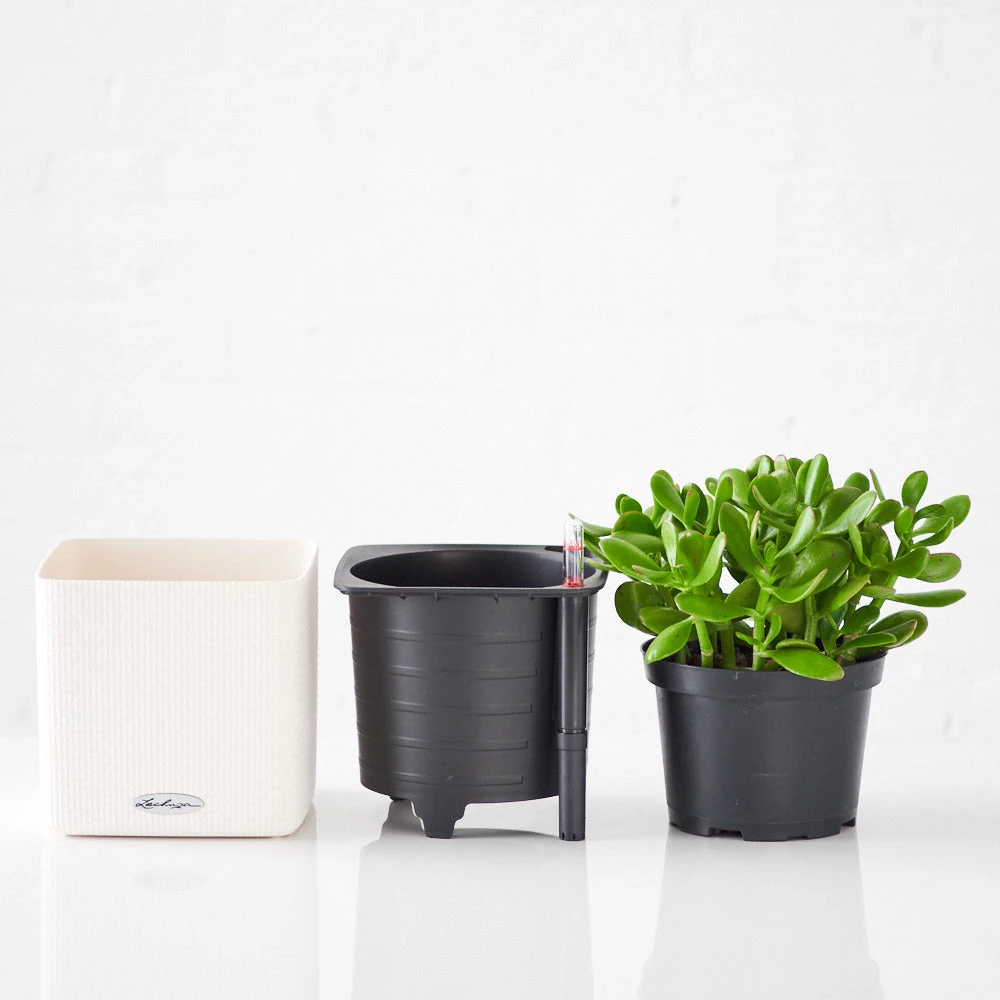 Jade plant is placed in this attractive and compact Lechuza Cube self-watering planter. This plant is believed to be a money and fortune magnet. 😀