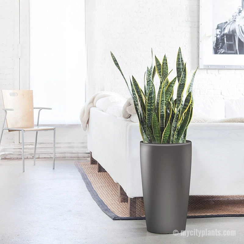 Sansevieria plant potted in modern medium height planter. Minimal care plant is the perfect choice for home or office.