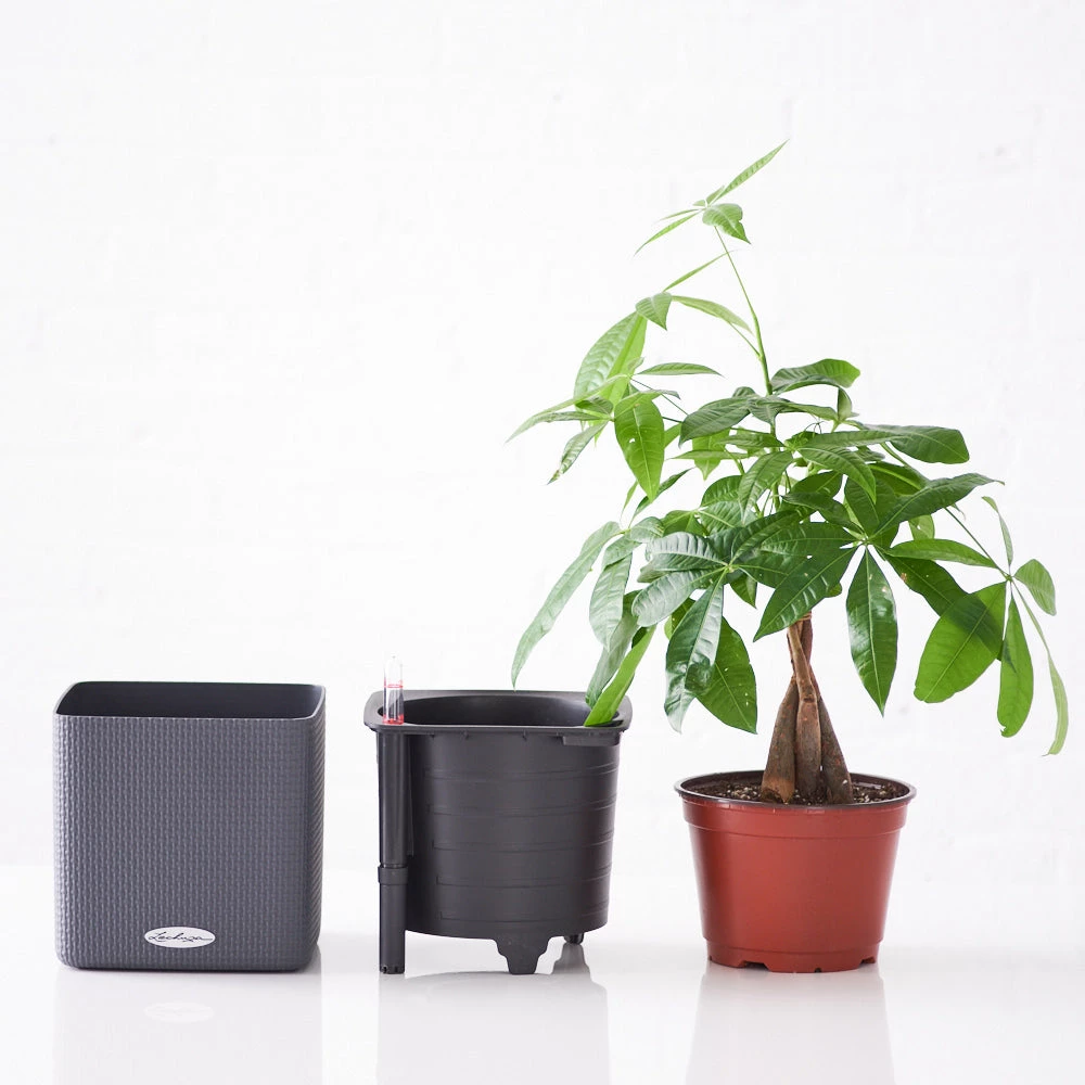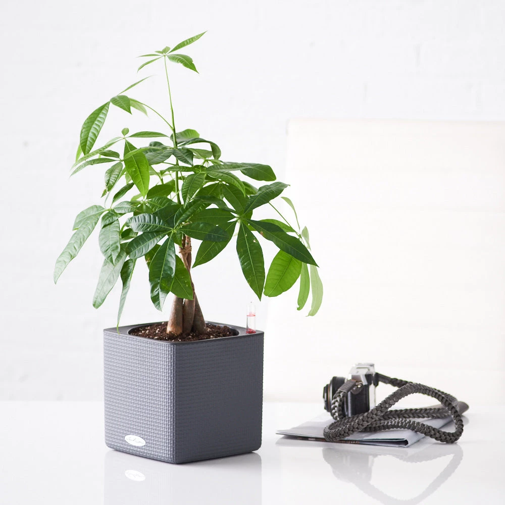 Money Tree is placed in this attractive and compact Lechuza Cube self-watering planter. Feng Shui recommends having this plant nearby to attract good fortune.
