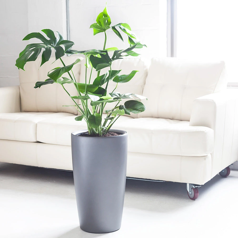 Planter: Built in sub-irrigation system (water your plant 3 times less often in comparison to regular pots). Made by Lechuza in Germany, shatterproof, 100% recyclable plastic.