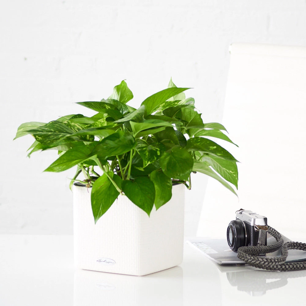 Pothos plant is placed in this attractive and compact Lechuza Cube self-watering planter. One of the top houseplants for improving indoor air quality and easy care.