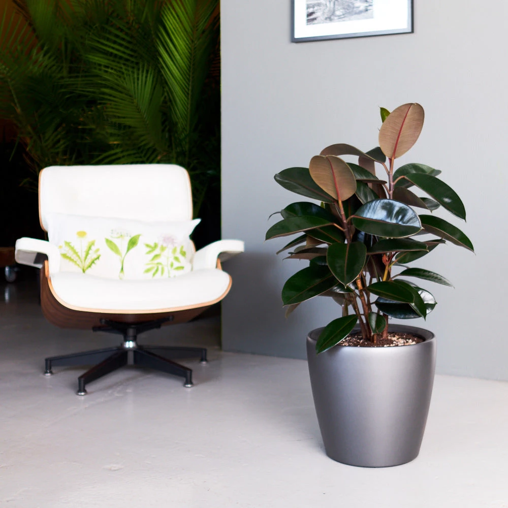 Rubber plant bush is potted in the simple modern planter. This attractive plant has dark thick leaves that deliver a dramatic look to any space. Strong air purifier and, definitely, the attention catcher.