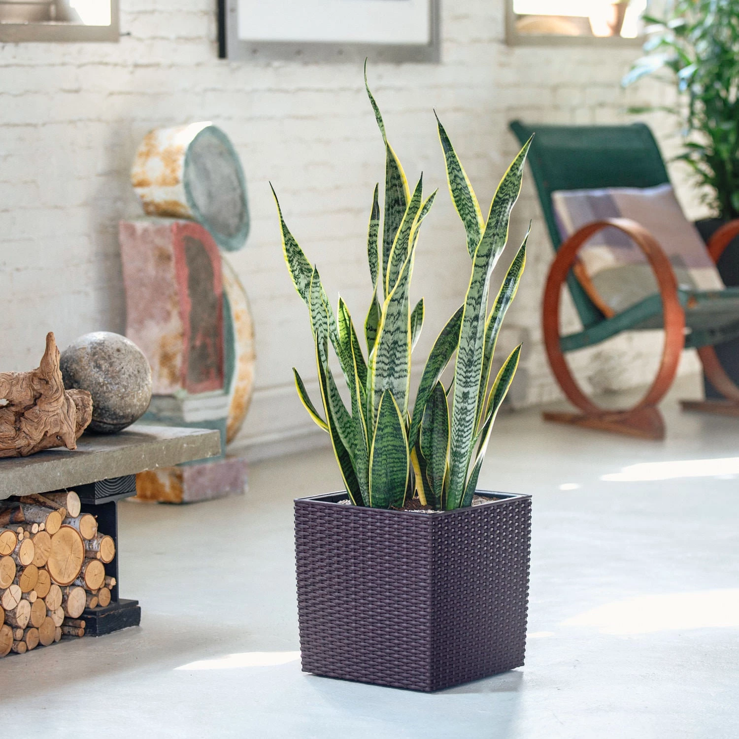 Sansevieria plant is a powerful air-purifying plant and low maintenance, easy-to-care-for. The perfect plant for those who are new to the plant world. It is the best plant to have in your bedroom as it produces oxygen at night. Cube cottage planter can be used for floor display or placed on a wide window ledge, countertop, or side table. This wicker design planter adds warmth and rustic touch to any modern interiors.