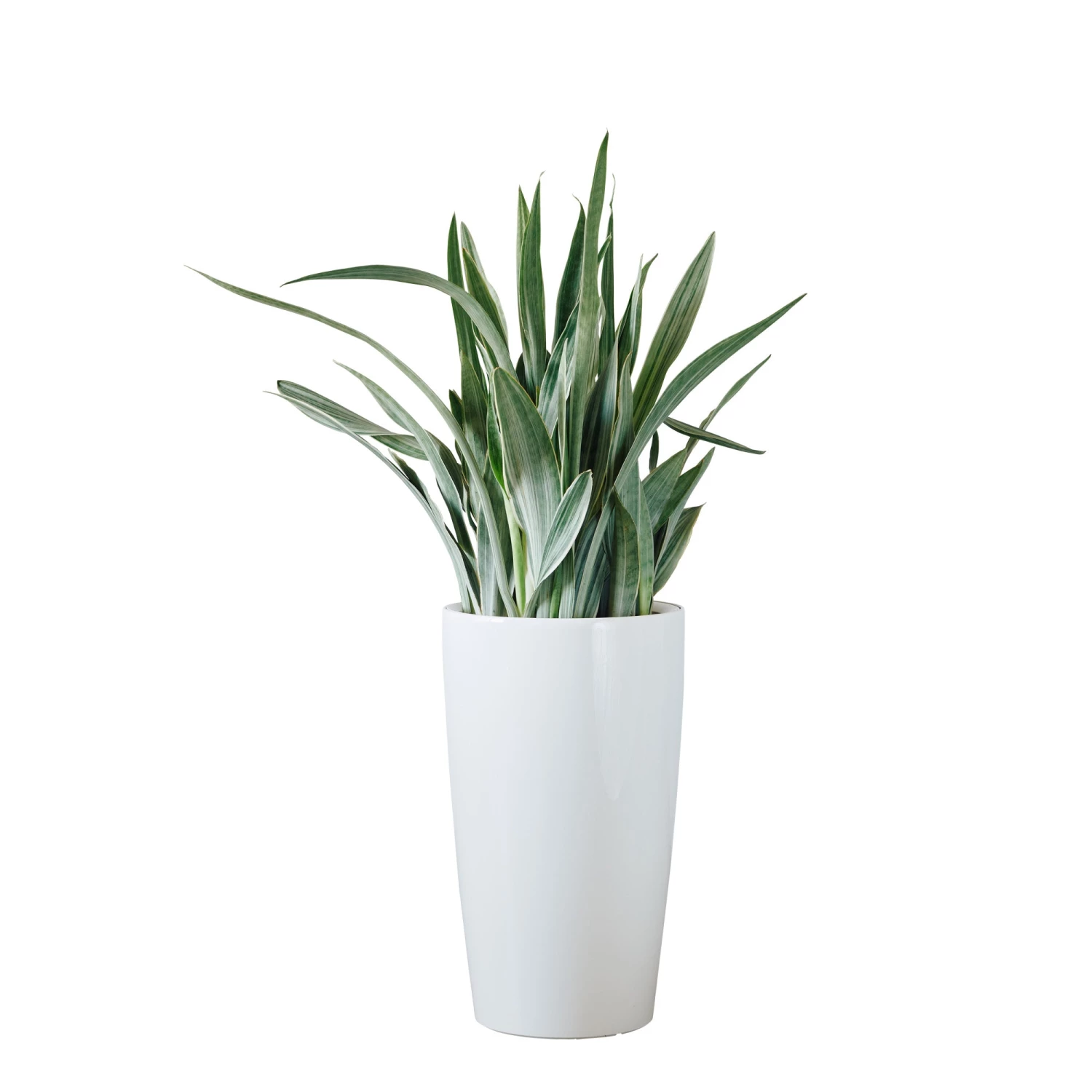 Potted in the elegant, tall, self-watering Rondo planter. Beautiful silvery-green color leaves will brighten any room. This plant is more uncommon Sansevieria variety a.k.a. Sansevieria Metallica or Sansevieria Silver Siam.