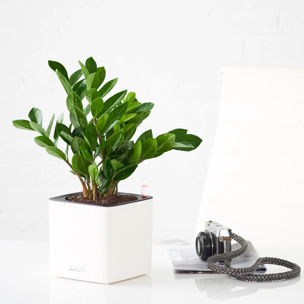 ZZ plant is placed in this attractive and compact Lechuza Cube self-watering planter. This one can take months of neglect and still look amazing. Also a great air purifier. Perfect match for a busy person.